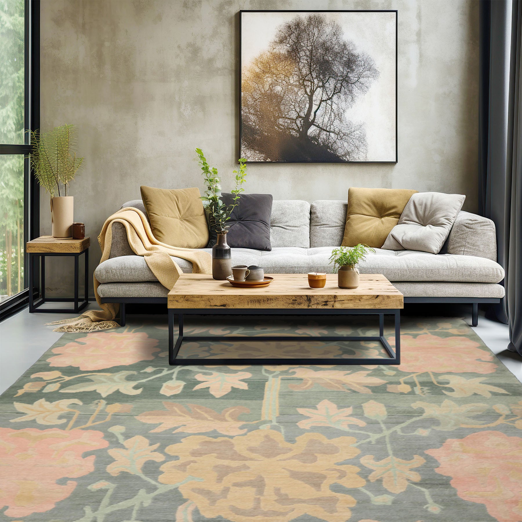 From Nepal, this Tufenkian Tibetan rug presents an Art Deco floral composition with modern elegance. Its soothing aqua field is enlivened by oversized blossoms in rose, beige, ivory, and gold. Woven from fine wool with a 0.6" pile, the rug undergoes a Swiss Wash finish that enhances softness and creates a silky surface. With its painterly motifs and understated luxury, this rug provides a graceful focal point for serene and stylish interiors.