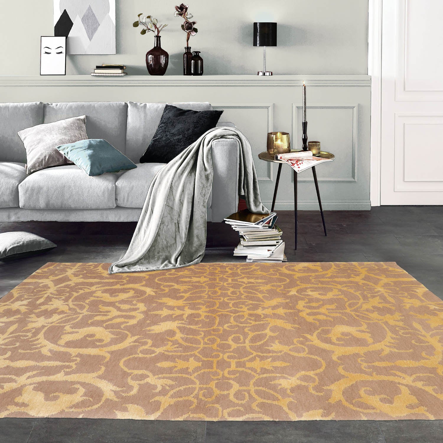 Before you is a beautiful hand knotted Tibetan wool & silk rug from Nepal. The wool not only adds to rug's durability, but also provides dirt repelling quality and thermal insulation. The silk, on the other hand, gives a unique sheen to the rug. The rug's transitional design is versatile to suit different decor themes. Its elegant style is easy to decorate with and perfect for living room, dining room, bedroom or anywhere in the residence or office.