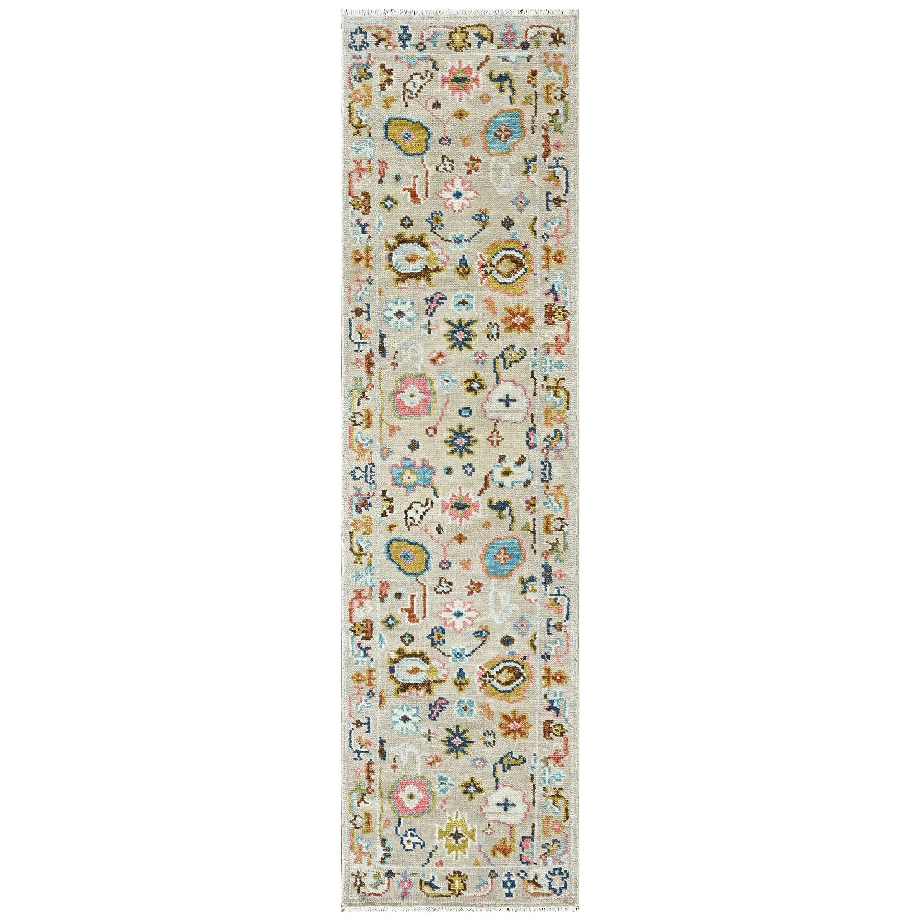 Created for narrow and elongated interiors, this 2'6" x 9' hand-knotted wool transitional runner introduces decorative detail with a light, livable touch. Made entirely from wool over a cotton foundation with a medium pile height, it delivers both durability and everyday comfort while maintaining visual softness. Instead of relying on a strict medallion format, the design flows as an all-over composition of small floral rosettes, abstract blossoms, and gently curving vine elements that repeat evenly along the runner’s length. This continuous distribution encourages a sense of movement rather than drawing attention to a single focal point. A warm beige base sets a calming tone, while soft gold outlining links the motifs and provides subtle definition. Notes of blush pink, airy aqua, and muted green add freshness and color variation, resulting in a palette that feels light, organic, and thoughtfully balanced. Each hue appears intentionally placed, creating gentle shifts as the eye travels down the runner. Well suited for hallways, kitchens, entry corridors, or bedside placement, this 2'6" x 9' hand-knotted wool transitional runner brings warmth, charm, and visual flow to narrow spaces without overwhelming them.