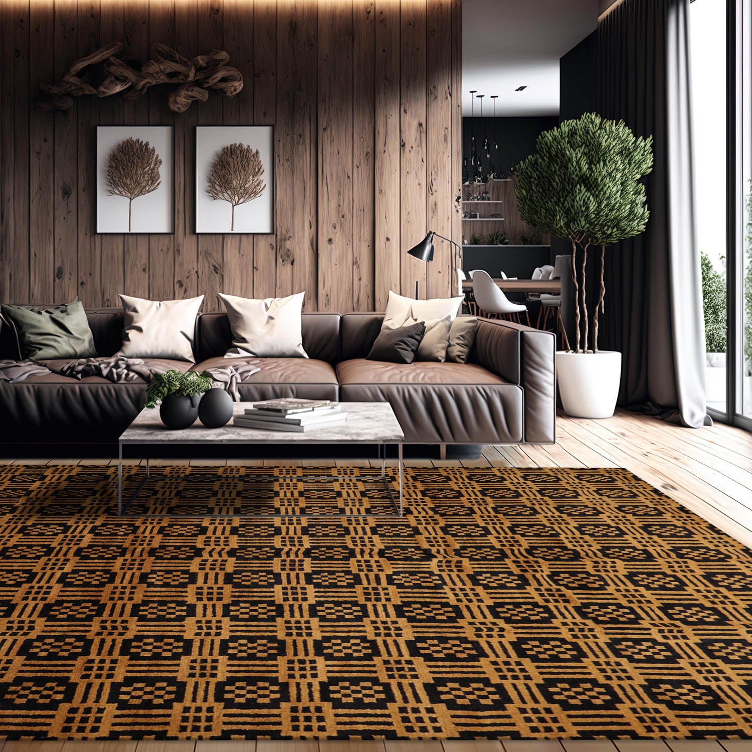This is a beautiful Black, Gold, Brown Color Michaelian & Kohlberg design Hand Knotted, Tibetan Oriental 100% Wool Rug.