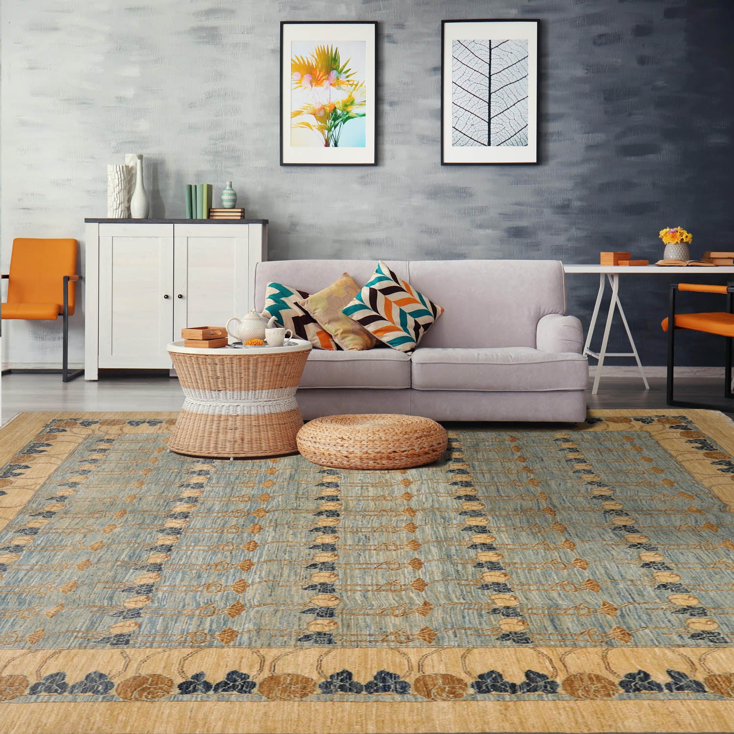 Story Behind the Art: Hand-knotted rugs are Pakistan's second-largest cottage and small industry that began as early as the 11th century under the Mughal rule. The craftsmen have the capacity to produce any type of rug using all the popular motifs of guls, medallions, paisleys (botehs), traceries, and geometric designs in various combinations. While the "stone washes" are used to fade and soften colors, the Peshawar style is characterized by a thinly sheered pile, large print designs, and most predominantly, their antique ivory and sometimes golden tones.