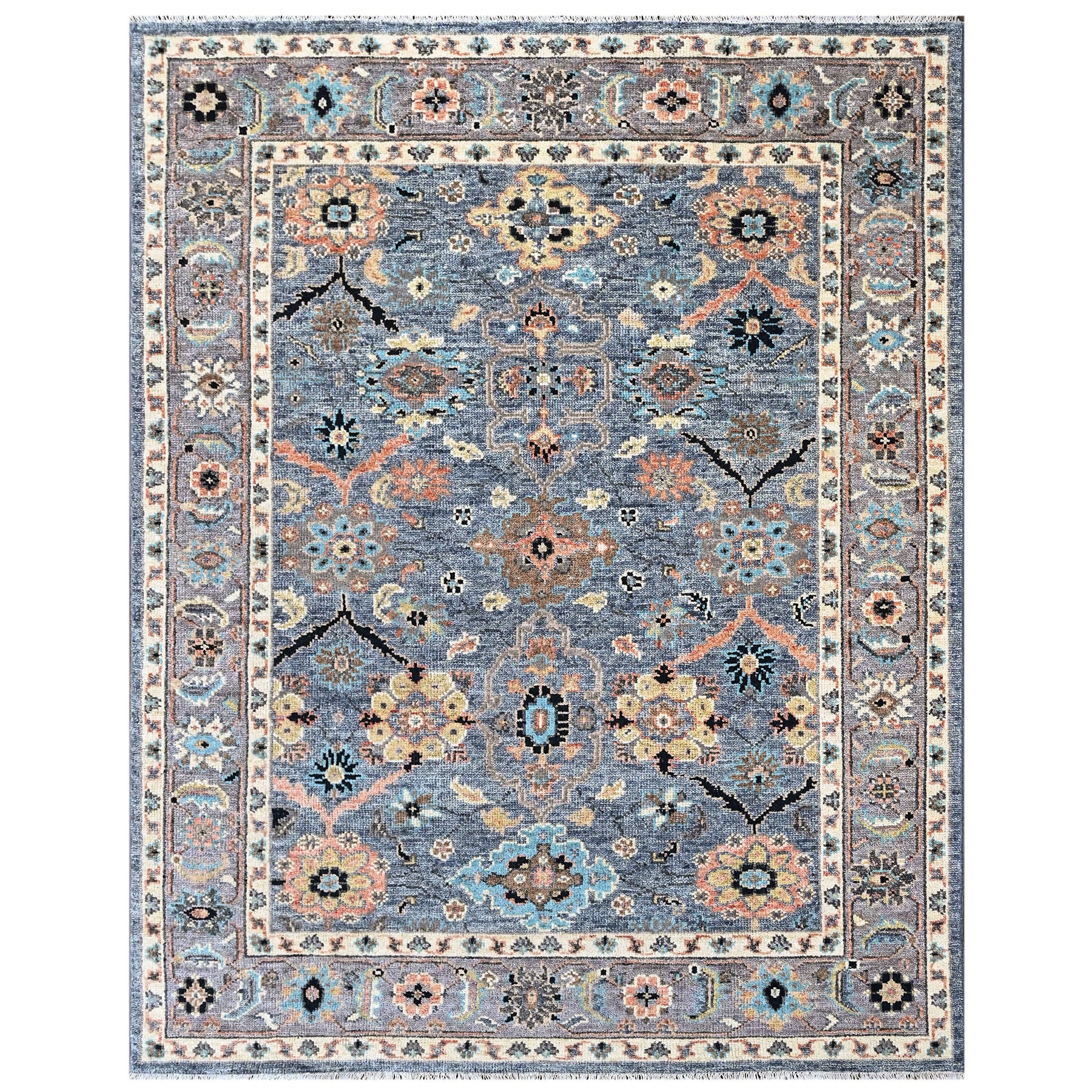 Reflecting the decorative richness and structural clarity of the Arts and Crafts movement, this 8x10 hand-knotted wool rug is constructed with a medium pile on a durable cotton foundation, offering a refined blend of texture and longevity. The composition features a balanced, symmetrical layout with a softly articulated central motif surrounded by repeating floral medallions and stylized botanical forms inspired by nature and handcraft. A deep blue field layered with gray undertones provides a grounded backdrop, allowing accents of gold and rose to highlight floral elements and connecting vinework. Touches of aqua introduce freshness, while subtle black outlining adds contrast and structure without overpowering the palette. A continuous border of complementary floral and geometric motifs in coordinated shades of blue, gray, gold, and aqua reinforces visual cohesion. Rich yet approachable, this rug suits living rooms, studies, dining areas, or layered seating spaces where an Arts and Crafts aesthetic can anchor the room with warmth and timeless character.