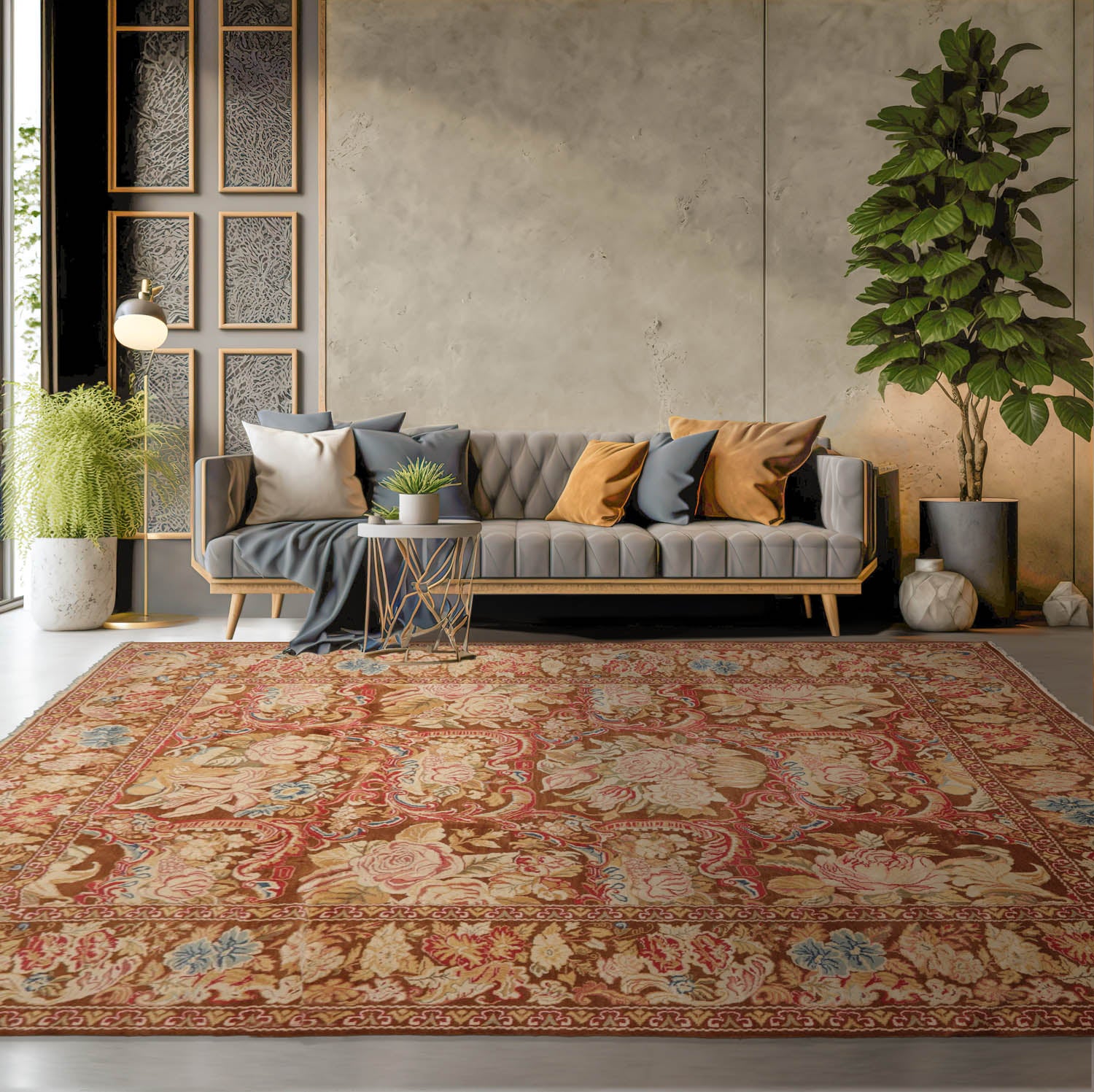 An absolute stunner! Crafted in its name sake city, this rug reflects only the best of its tradition. Made from natural dyes and high-quality wool, the rug is consummate symphony of craftsmanship, technique, and design. With large scale design of repeating floral motifs and earthy color palette, this rug can be also be categorized as an Arts & Crafts rug for its sheer versatility and monumental design scheme. Its color palette of Brown, Beige, Rose, Blue, Gray, Tan, etc. is meant to blend and ground your home interiors.