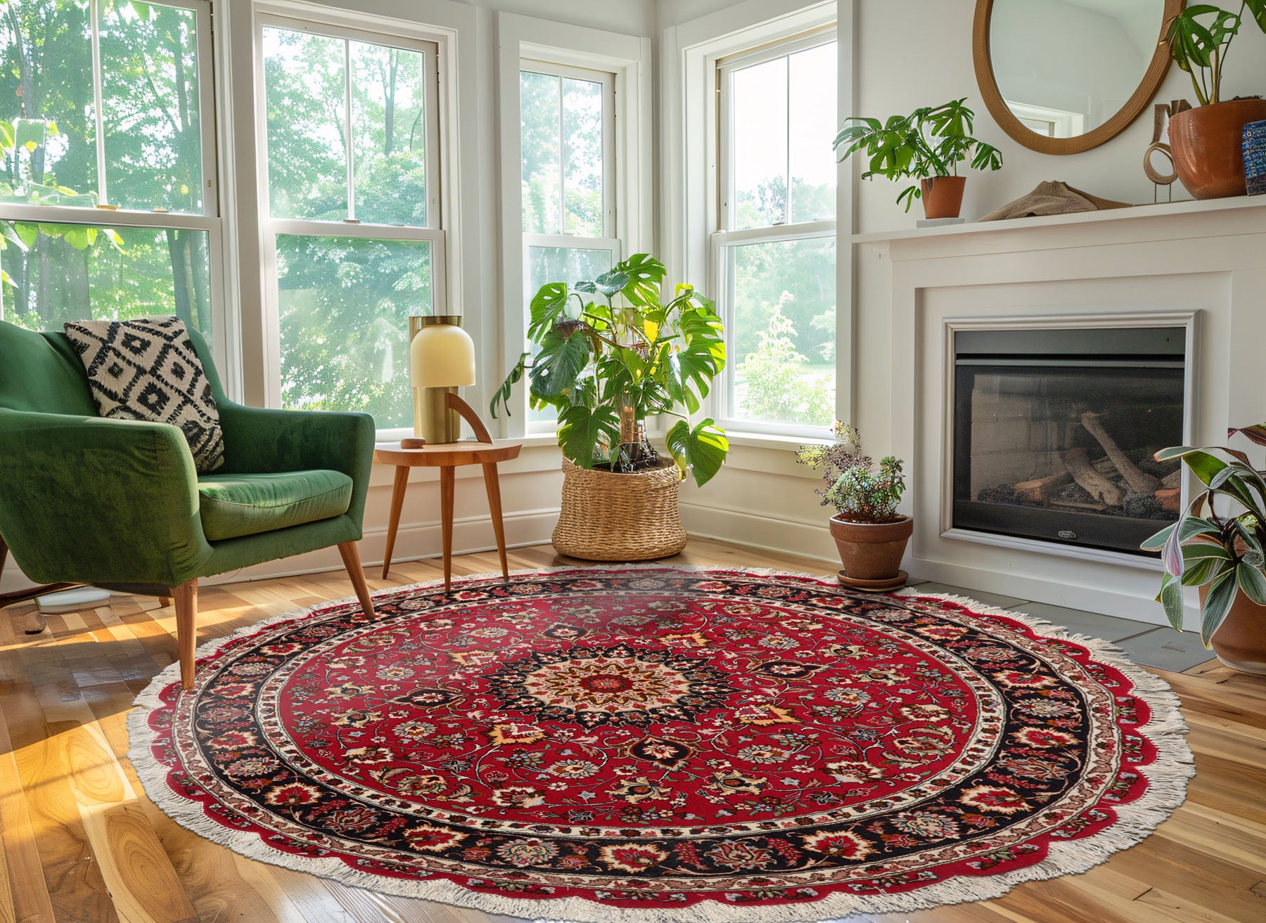 This round Tabriz rug radiates timeless grandeur, finely hand-knotted at 300 KPSI in a luxurious wool and silk blend. Its burgundy field glows with richness, anchored by a dramatic starburst medallion surrounded by vines and floral motifs in ivory, black, green, and blue. A bold floral border strengthens the symmetry, while silk accents add a subtle shimmer as the light changes. Both decorative and durable, this Oriental Persian rug represents artistry at its finest, bringing collectible value and regal sophistication to any interior.