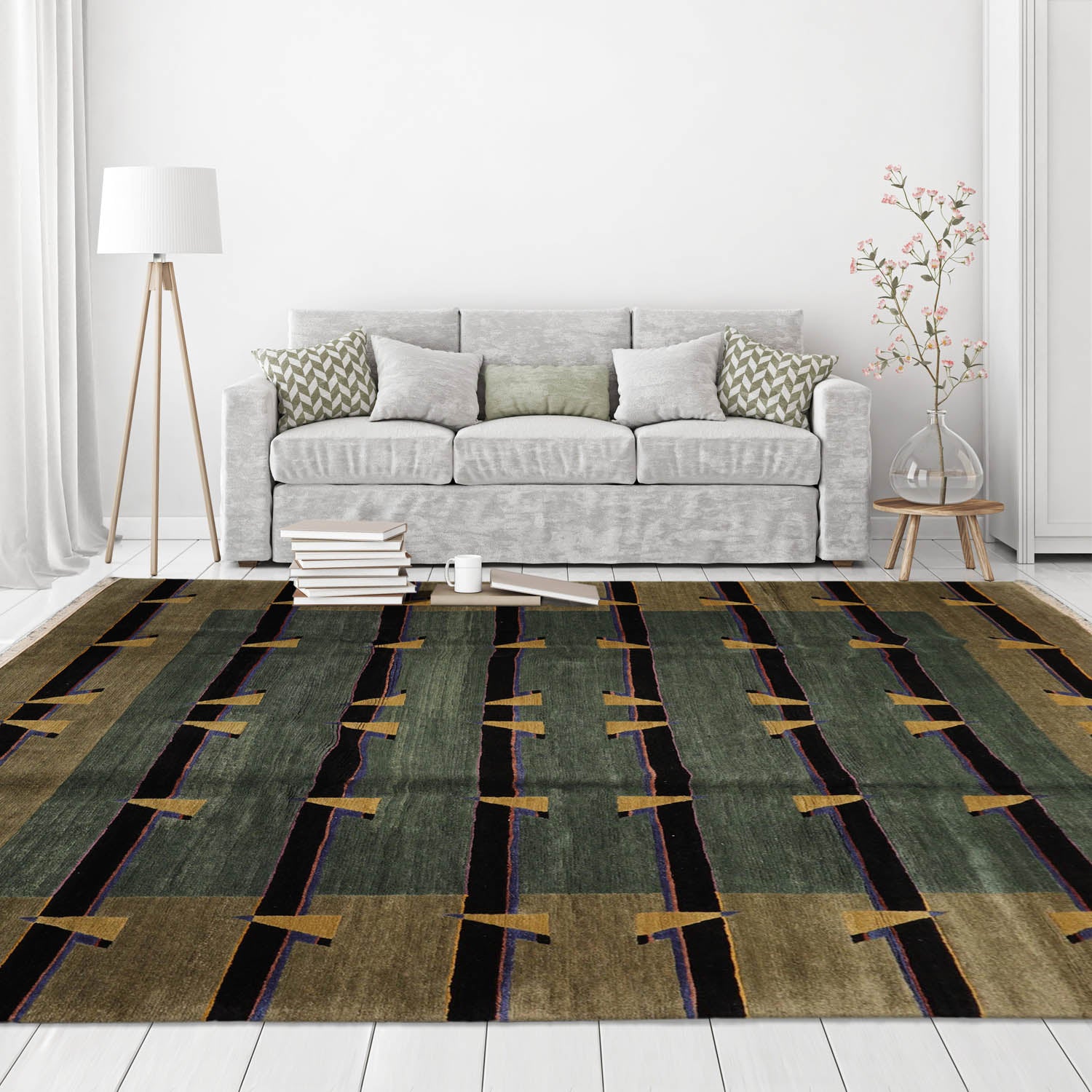This is a beautiful Celadon, Moss, Light Gold Color Michaelian & Kohlberg design Hand Knotted, Tibetan Oriental 100% Wool Rug.
