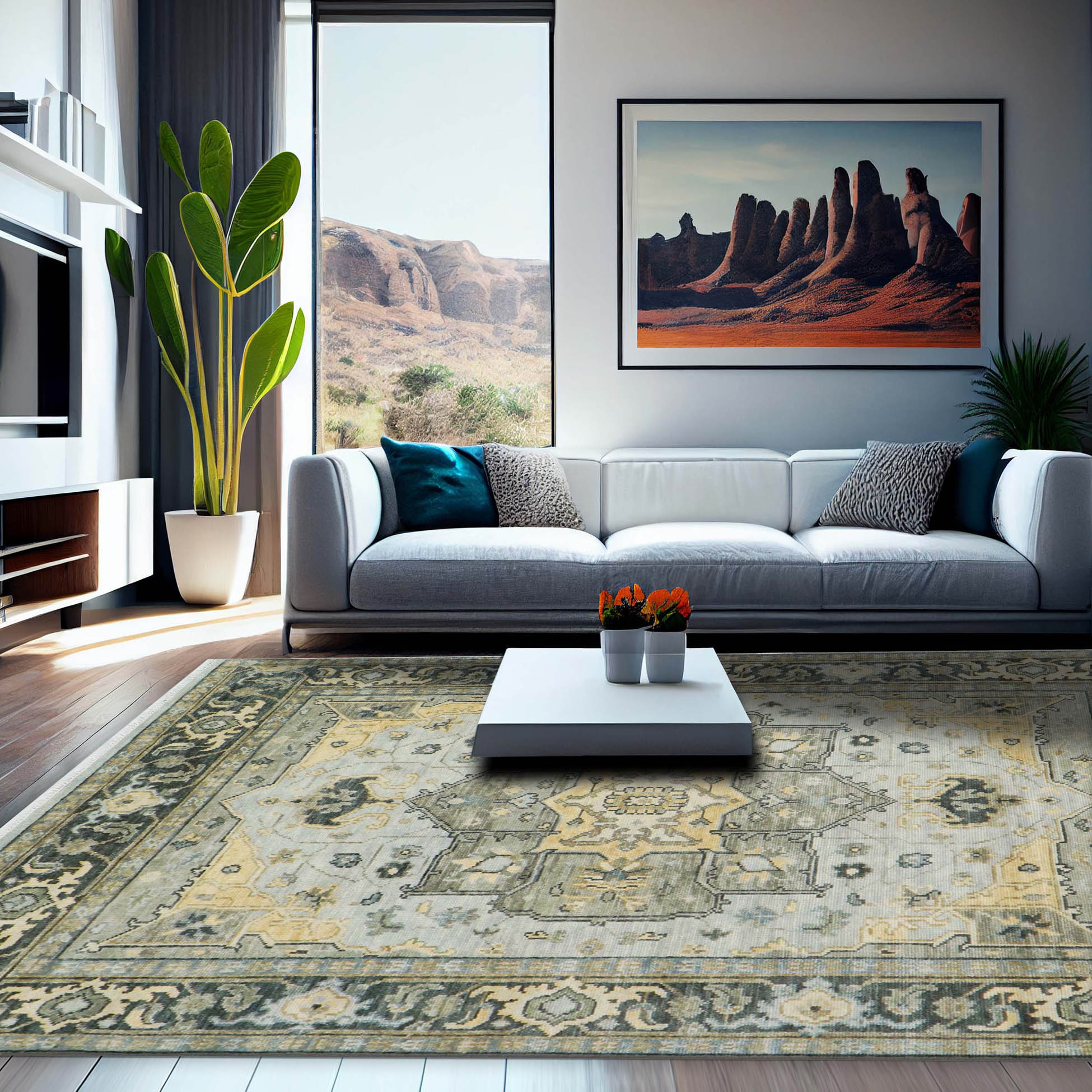 This is a beautiful Gray, Moss, Light Gold Color Hand Knotted, Turkish Oushak Oriental 100% Wool Rug.