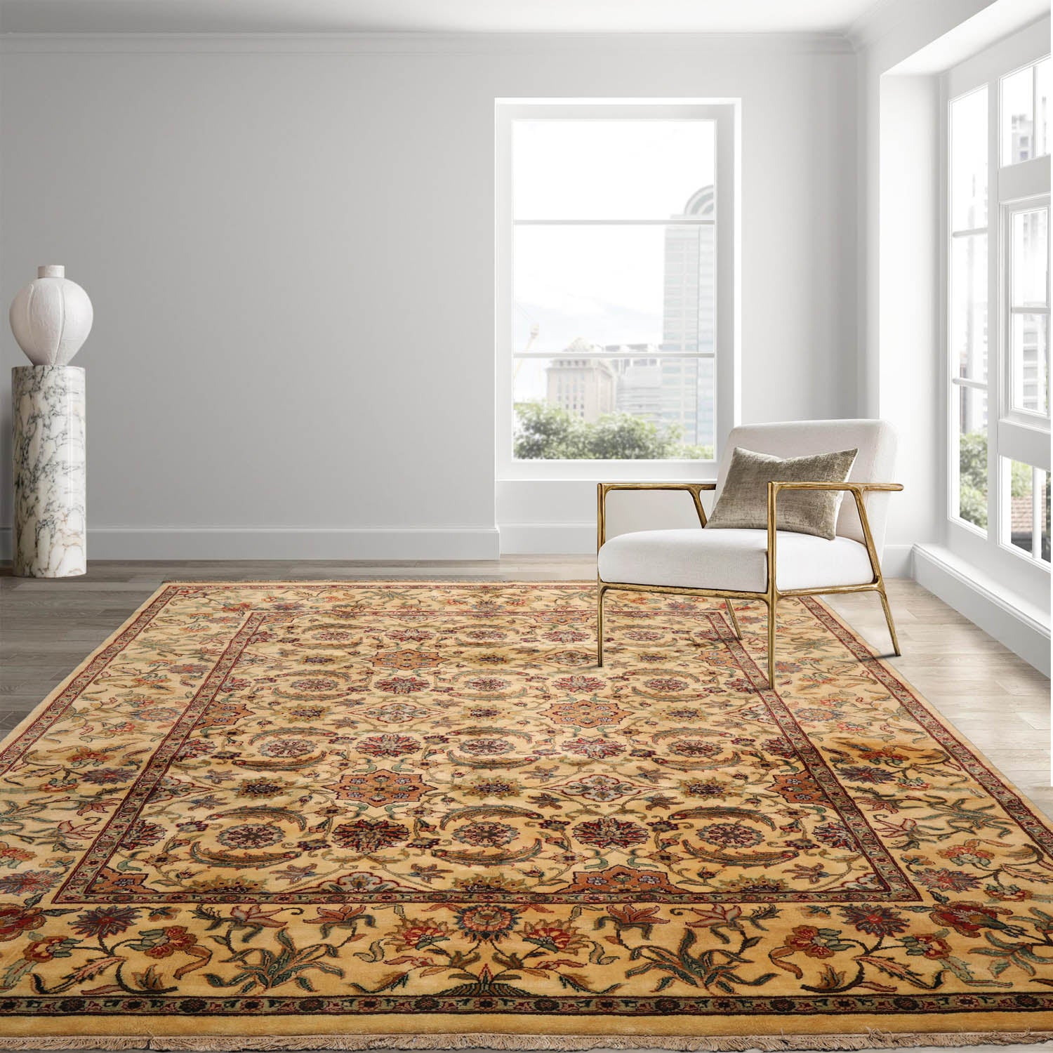 Story Behind the Art It was during the Mughal rule in India that the rug industry reached its zenith and came on its own as an art form. With Emperor Akbar setting up rug weaving centers in Agra, Delhi and Lahore during the late 16th century, the rugs produced designs that followed the Persian style. However, by the 17th century, the Indian rugs began to grow their own lexical and semantic iconography and differed significantly from the Persian prototypes. Tight weaving, silk like wool, bright, deep color range and realistic motifs became the defining feature of Indian rugs. It is this combination of exquisitely detailed and painstaking craftsmanship and masterful interplay of design elements that has earned Indian rugs age-defying allure and patronship defying borders and time. Today the Agra rugs combine the grandeur and grace of the well-known Persian antique rug designs with their own original themes. The Agra rug is famous for its use of floral tendrils, angular vines and stars and favors all-over angular designs with scrolling leaves, vines and large finely detailed flowers with bold floral borders.