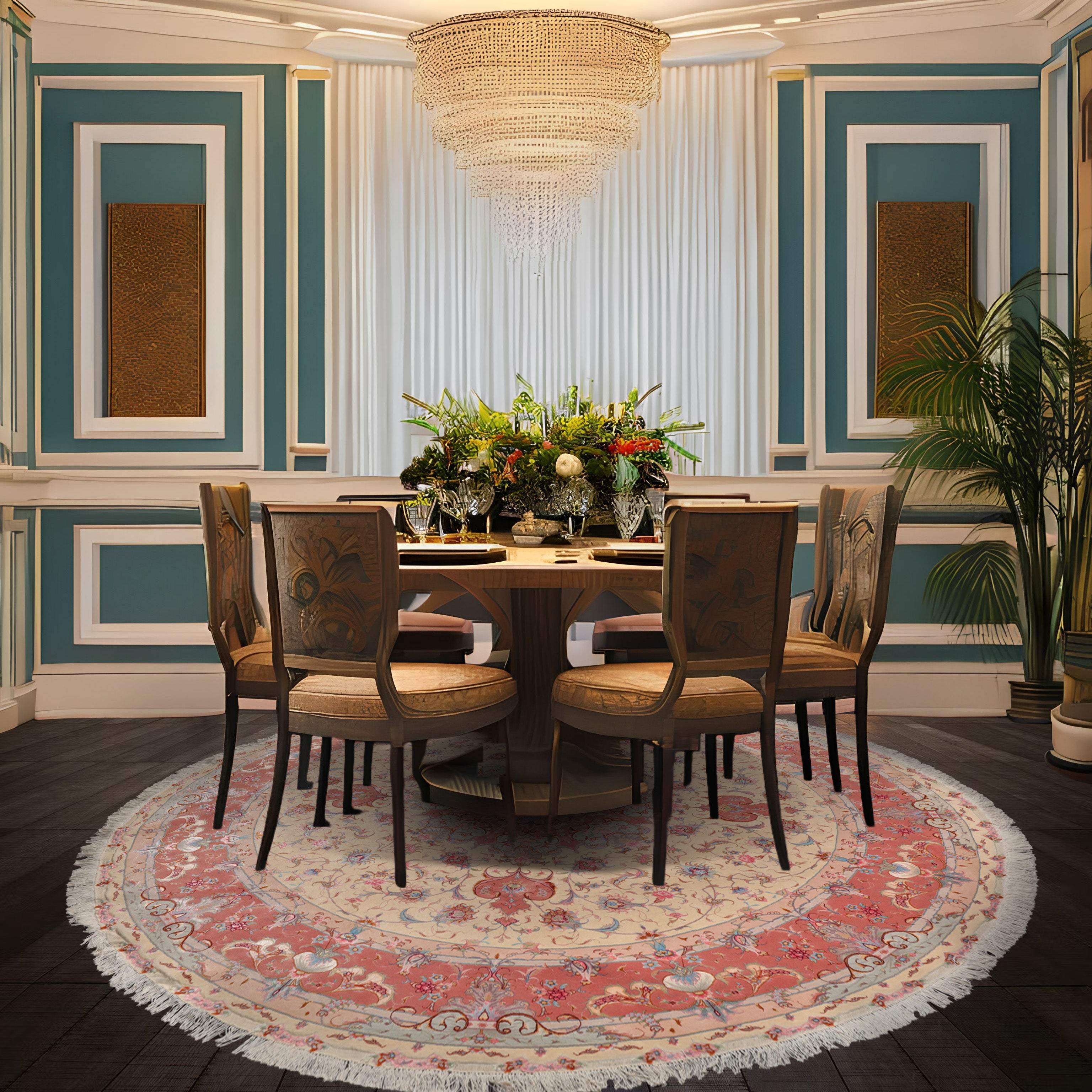 This is not a rug...it is a work of art... an authentic artifact...beauty most sublime... where our passion, hope and ambition come together to appreciate what the artisans of yore have wrought with threads of wool and silk. The natural wool adds not only years to the rug, but also provides dirt-repellent qualities and thermal insulation. The silk, on the other hand, provides a unique shine to the rug which seems to transform when viewed from different angles. The design seems on pointe with its elegant arabesques and floral motifs which complement its subtly ornate center medallion. The color palette is composed of pastel shades of rose, ivory, blue and brown. The overall effect is one of precision, an art form come alive when technique, craftsmanship and design intersect.