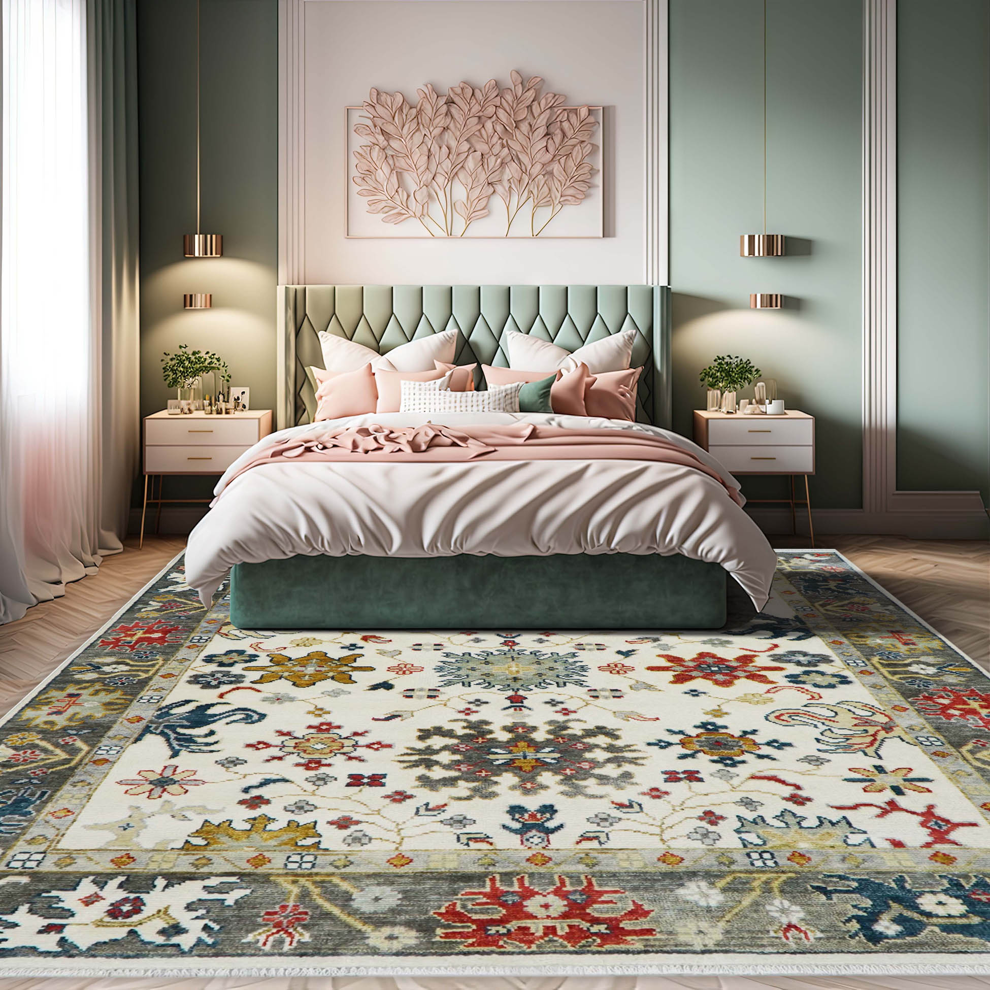 It has been produced using an identical weaving method and the design repertoire of the original Turkish Oushaks. Cosmopolitan and sophisticated in look, the rug has been handcrafted by artisans to a flawless composition. The main field comprising highly stylized floral and botanical elements is encompassed by a handsome multi-band border. The design of the border compliments the inner field and adds gentle grandeur to the artful composition of the rug. This rug representing an illustrious legacy of exquisite artistry and intricate craftsmanship is primed to add visual glamor and class to its surroundings. Its soft texture and timeless design make it ideal to enhance any space where it is placed.