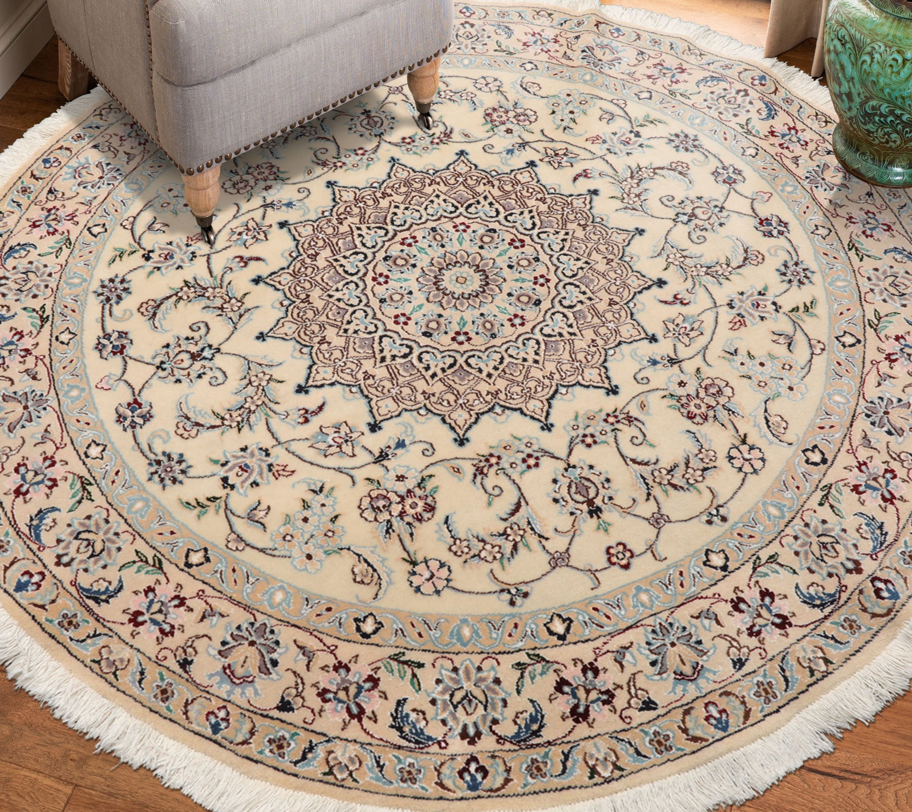 Story Behind the Art: Nain rugs, woven near Isfahan, are known for their delicate designs and refined elegance. Typically crafted with a wool pile on a cotton foundation and accented with silk highlights, they boast very high knot densities, sometimes exceeding 500 knots per square inch. Their motifs often include medallions, arabesques, and fine floral scrolls, all woven in serene palettes of ivory, cream, soft blue, beige, and touches of burgundy. Nain rugs are celebrated worldwide for their precision and harmony, treasured as both collectible works of art and graceful home décor.