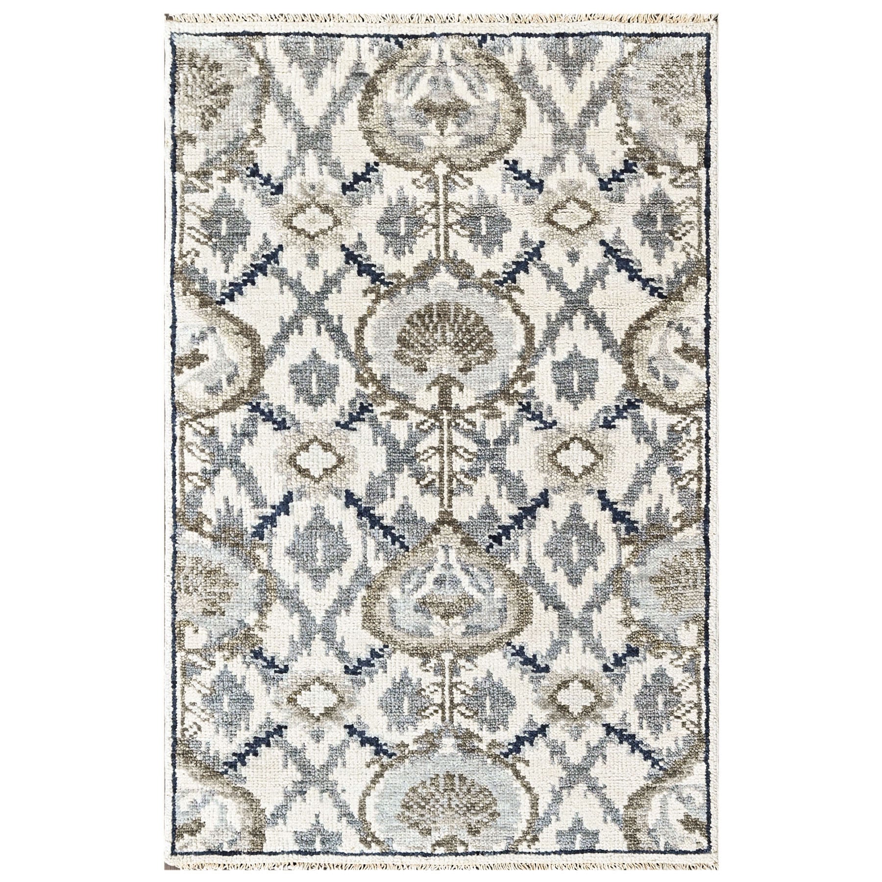 Designed to balance pattern with restraint, this 3'6" x 5'6" hand knotted wool transitional rug brings classical structure into a more intimate scale. Handcrafted from premium wool on a cotton foundation with a medium pile height, it delivers the durability and refinement associated with traditional hand-knotting. The composition is organized around a repeating lattice of medallion and diamond forms arranged symmetrically to create order and continuity. Rounded palmette-style medallions anchor the pattern, while smaller geometric accents fill the surrounding space, producing a detailed yet composed surface. The palette blends ivory and warm beige with layered gray tones, punctuated by muted blue accents that surface subtly throughout the design. Colors are woven closely together, allowing the pattern to emerge gradually rather than assert itself immediately. Natural variation in the wool adds texture and depth, reflecting the handcrafted construction. Ideal for bedrooms, reading nooks, or entryways, this 3'6" x 5'6" hand knotted wool ivory transitional rug offers a refined foundation for compact spaces that favor timeless design and quiet visual structure.