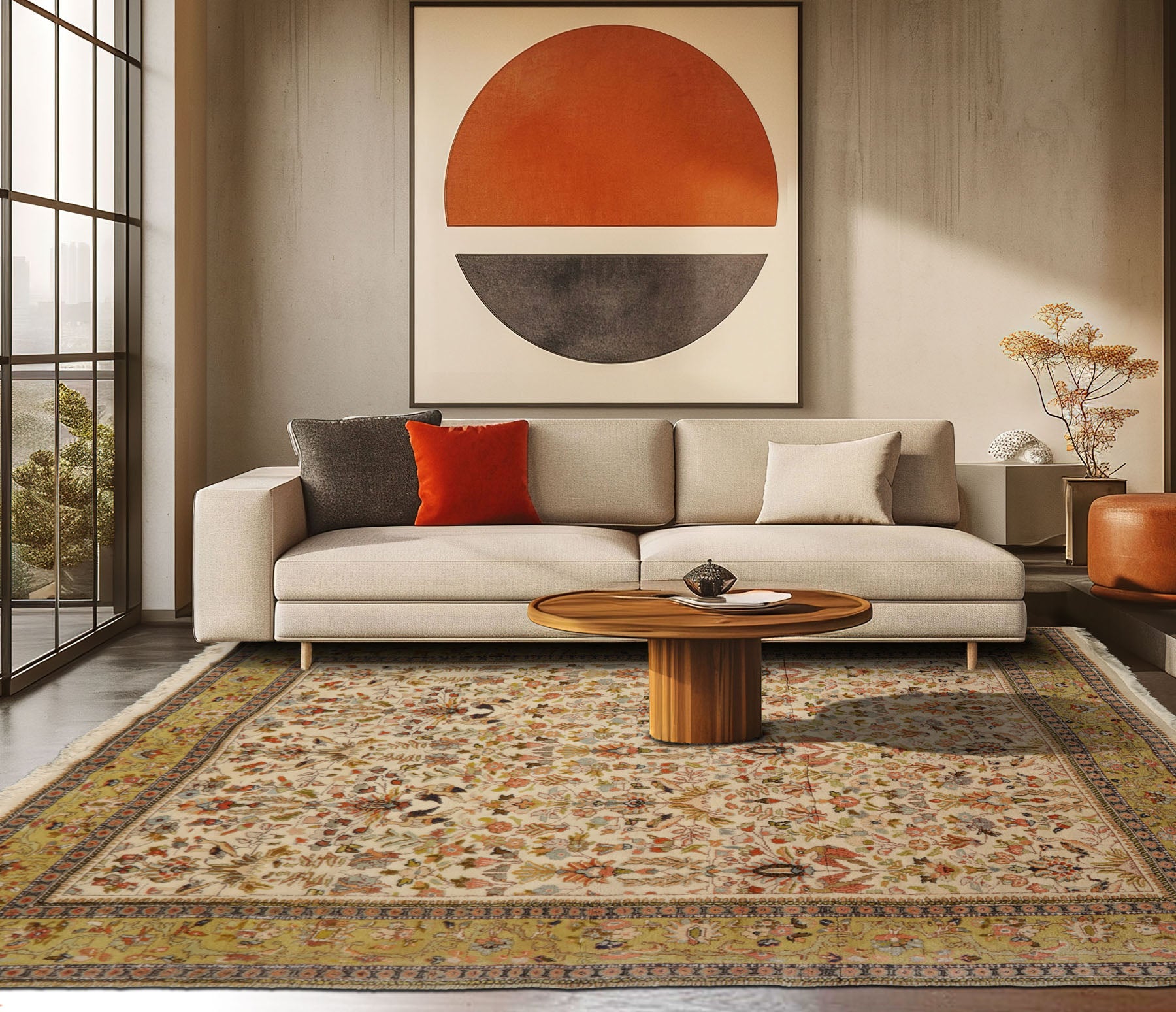 Story Behind the Art: Originating in the historic city of Tabriz, these Persian rugs are widely regarded as masterpieces of technical precision and artistic refinement. Renowned for extremely fine knotting, they allow for curvilinear patterns, classical medallions, intricate arabesques, and delicate floral motifs. Tabriz rugs often feature luminous color palettes, including deep indigo, rich crimson, ivory, and soft pastels, meticulously balanced to achieve harmony across the entire composition. Celebrated for their elegance, cultural significance, and durability, Tabriz rugs remain treasured as both collector pieces and functional works of art, enhancing interiors with centuries-old Persian design sophistication.