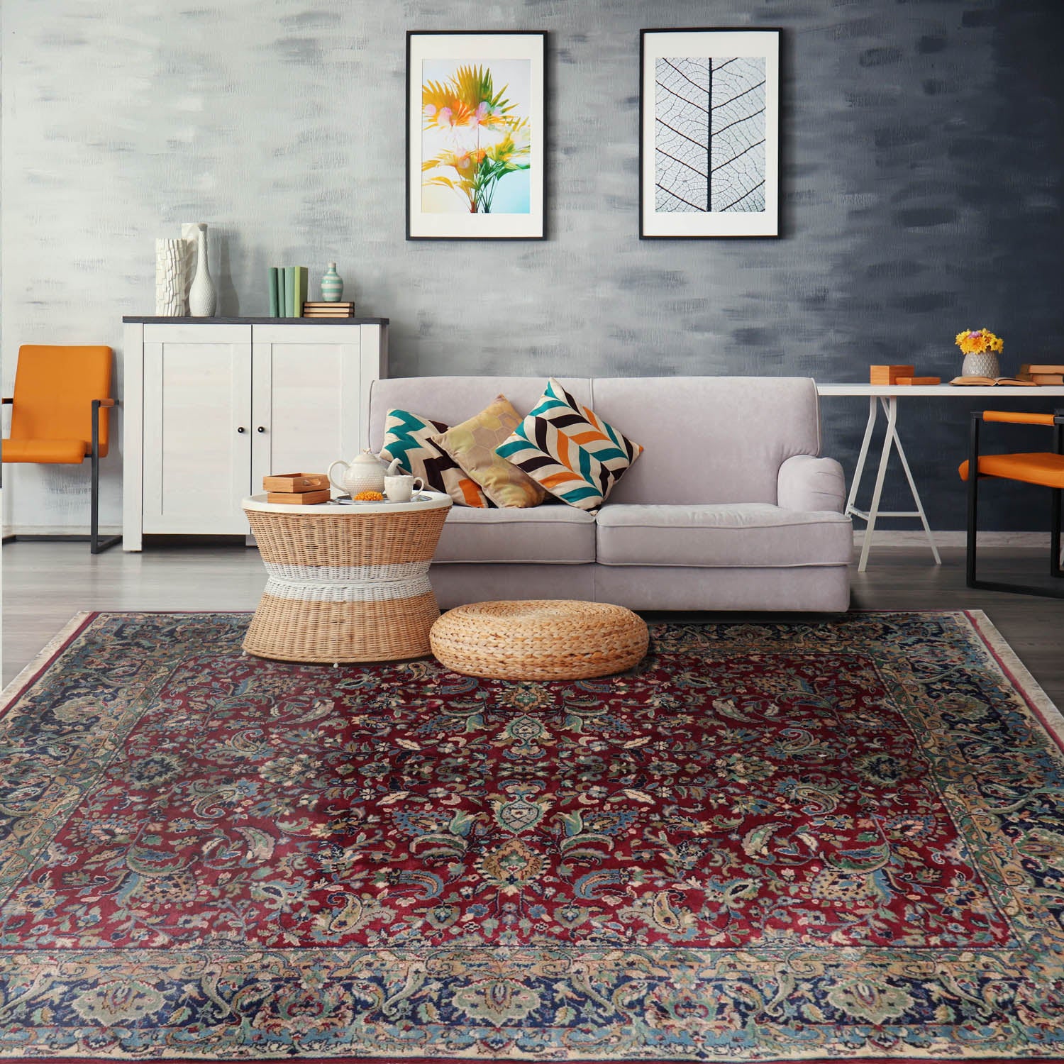 Story Behind the Art Khorassan rugs and rugs are famous for their fine rugs dating back to the Timurid empire in the late middle ages. Khorassan rugs are famous for their vivid purplish red, crimson, or vivid red background. The natural red color is obtained from a plant with red granule that only grows in the Khorassan region. Other general colors that are used in Khorassan and Mashad rugs are vivid red and purple tones, blue tones, navy, brown tones and a variety of green colors. It is also common for some Khorassan rugs to have a softer and more decorative coloration. There are many different designs, ranging from all-over patterns to arabesque medallions with corner-pieces, that are particularly noteworthy. The Herati border is also frequently applied. Another significant characteristic of Khorassan and Mashad rugs is the very soft and lustrous wool used in the production.