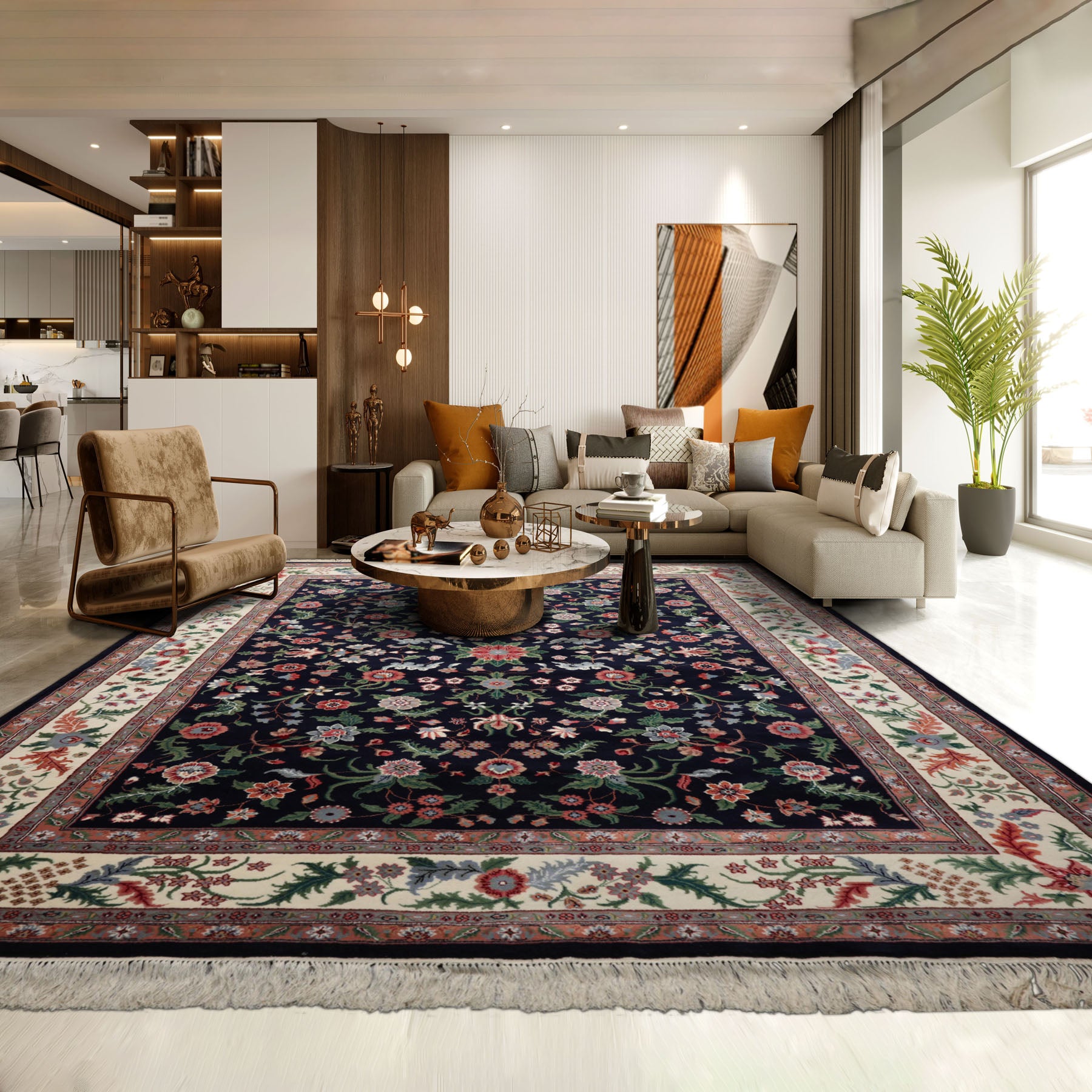 Story Behind the Art: The Mughal era in India marked the golden age of Agra rug weaving, when artistry and technique reached extraordinary heights. Established under Emperor Akbar in the 16th century, weaving centers in Agra, Delhi, and Lahore began by emulating Persian carpets but quickly developed their own distinctive language. By the 17th century, Indian rugs showcased tighter knotting, silk-like wool, rich jewel-toned palettes, and naturalistic motifs. Agra rugs are admired for their sweeping tendrils, angular vines, scrolling leaves, and oversized blossoms arranged in intricate allover patterns or grand borders. This unique blend of Persian grandeur and Indian creativity has given Agra rugs a timeless reputation for elegance, intricacy, and cultural refinement, making them highly sought after worldwide.