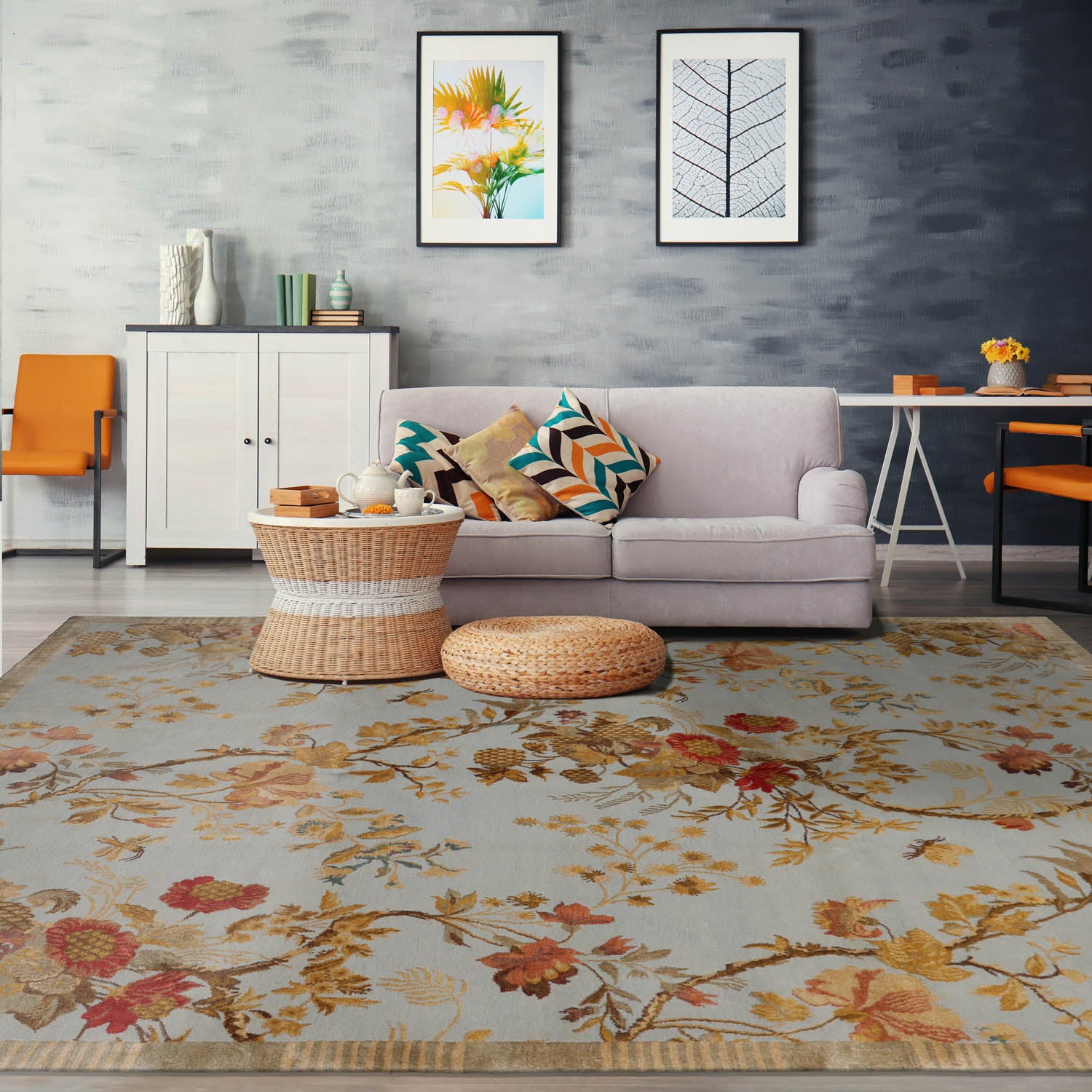 This is a beautiful Powder Blue, Sage, Gold, Coral, Gray, Brown, Blue, Multi Hand Knotted Mark Philips Tibetan Wool & Silk rug from Nepal. The wool not only adds to rug's durability, but also provides dirt repelling quality and thermal insulation. The silk, on the other hand, gives a unique sheen to the rug. Made by skilled craftsman, the rug is a beautiful symphony of elegant motifs, stunning colors, and consummate artisanship. Its botanical heavy floral design is easy to decorate with and perfect for living room, dining room, bedroom or anywhere in the residence or office.