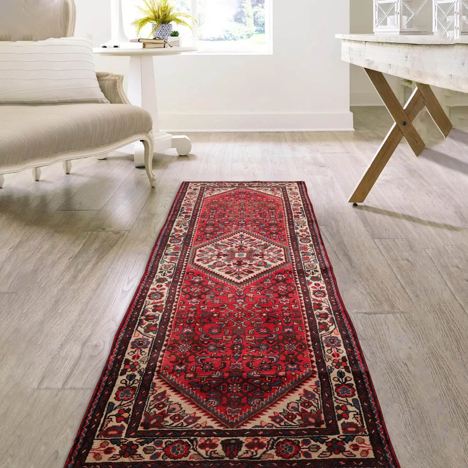 Before you is a gem from Persian rugs' vast repertoire of artisanal rugs, an authentic vintage Heriz runner rug. The rug represents the finest of rug traditions in the world and is a stunning composition of technique, craftsmanship and design. With a rich color palette, rug is a visual delight with a geometric medallion on an inner field decked with rectilinear floral motifs. The overall impression is one of uber sophistication, timeless beauty, and exquisite craftsmanship.