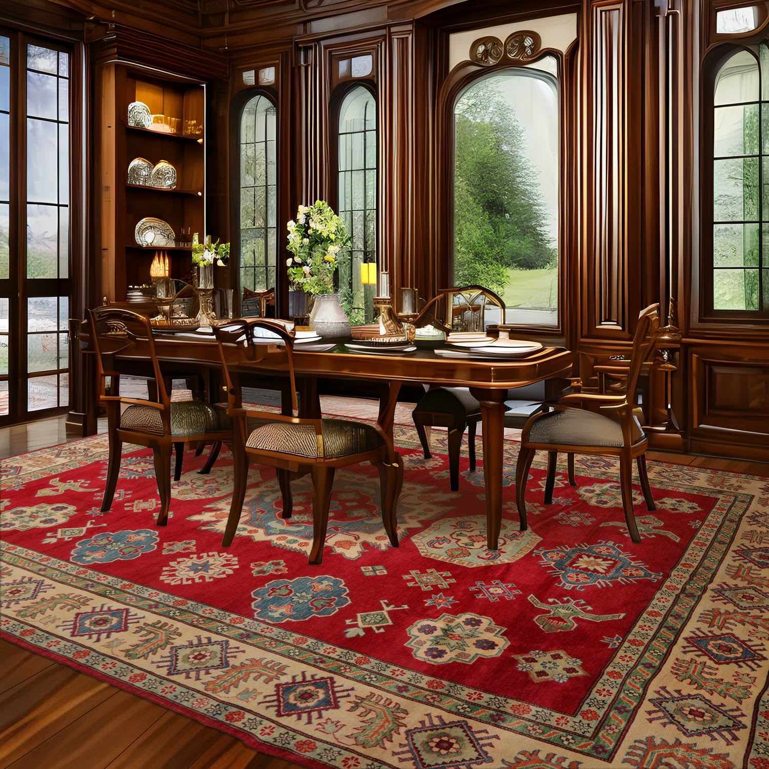 Story Behind the Art: Kazak rugs are well-recognized for their striking aesthetic, durability and highly saturated naturally dyed color tone. Originally woven by different tribes in the region of Caucasus Mountains, between the Black Sea and Caspian Sea, Kazak rugs feature distinct design patterns/motifs with geometric composition and tribal characteristics. Common patterns include medallions, rosettes, hooked polygons, diamonds and crosses as well as representations of animals, birds, trees and humans. Today Kazak rugs that are made in Azerbaijan or in Iran or near the Caucasus Mountains are referred to as Caucasian Kazaks, and Kazak style rugs that are made in Afghanistan are referred to as Afghan Kazaks. Pakistan has also emerged as an important center for production of Kazaks in the modern times.