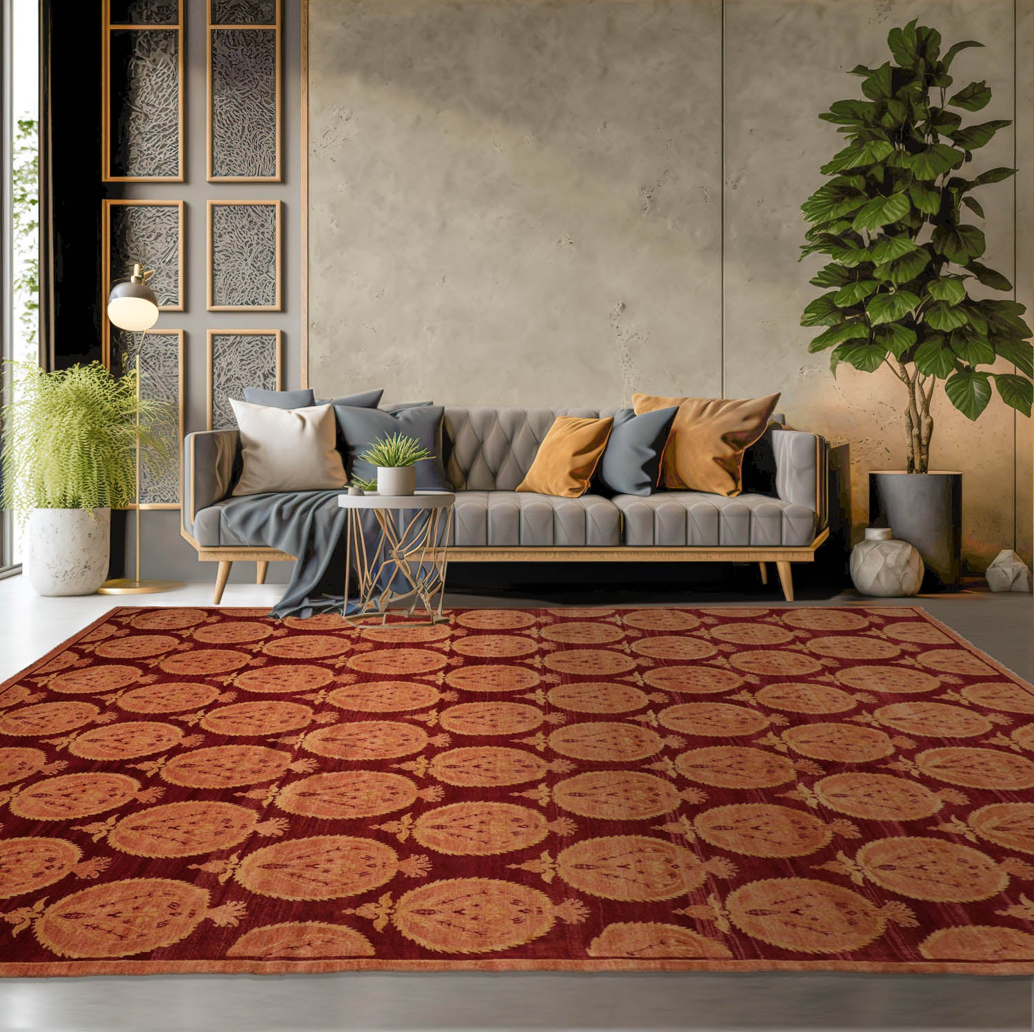 Stunning composition! This is a beautiful Rust, Peach & Light Gold Hand Knotted Michaelian & Kohlberg Wool Rug. The wool not only adds to rug's durability, but also provides dirt repelling quality and thermal insulation. This rug embraces the transitional pattern of botanical heavy design elements wholeheartedly. Its elegant style is easy to decorate with and perfect for living room, dining room, bedroom or anywhere in the residence or office.