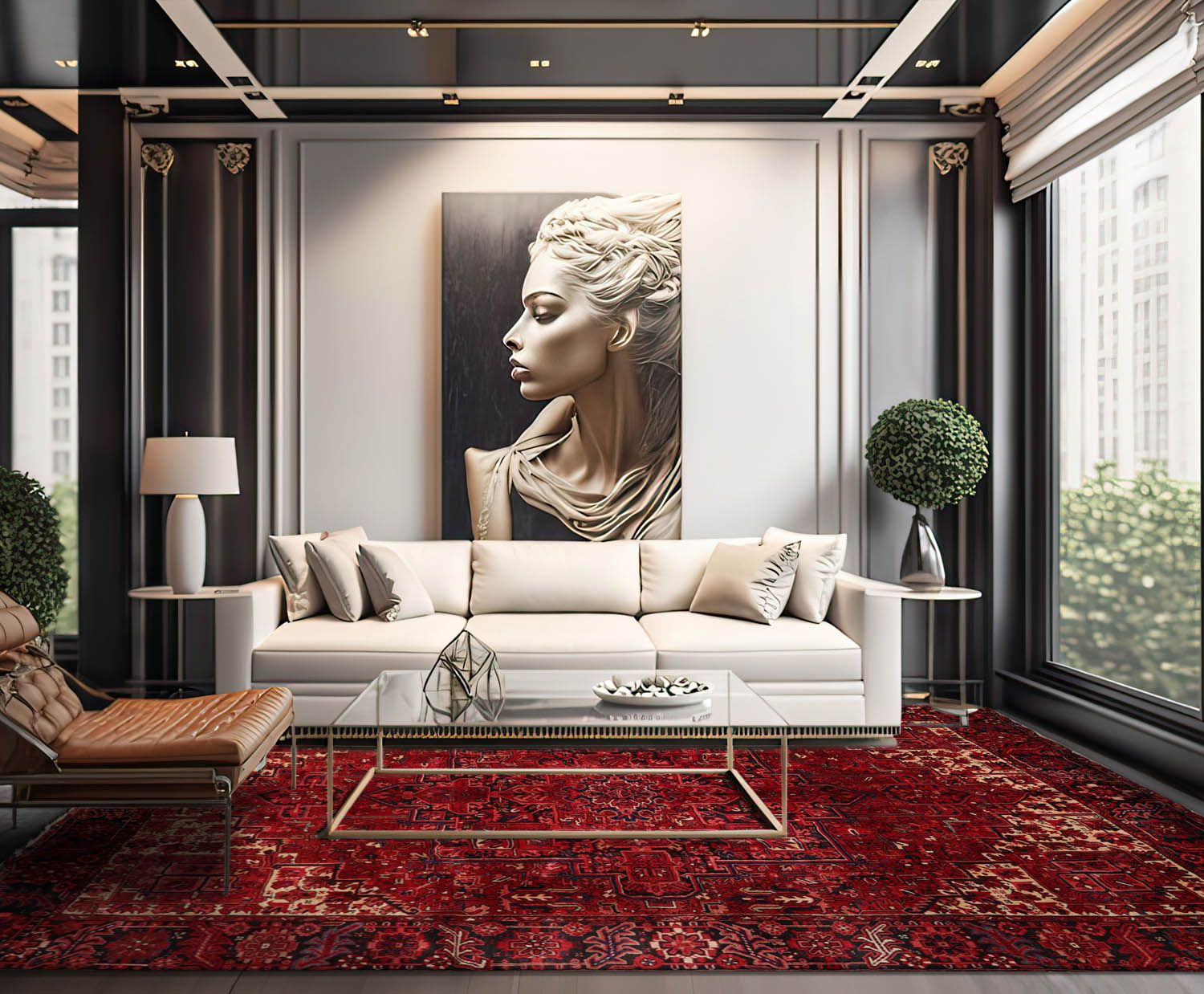 Story Behind the Art: Heriz rugs are Persian rugs from area of Heriz, East Azerbaijan in northwest Iran. Distinguished by monumental floral designs and the impressive angular drawing, Heriz rugs enjoy enduring popularity for their versatility and excellent craftsmanship. Even as most Heriz tend to have strong medallion designs accented using rich color, allover Heriz are not uncommon. Where other Persian carpets utilize a curved form, Herizes apply series of angular twists and turns, imparting an emphatic geometry to the design. Bright vibrant colors and characteristic bold patterns make these rugs easy to identify. Woven using knots 30 to 80 per square inch, Heriz rugs do not seem to be tightly woven as their Persian counterparts like Tabriz but are durable and famed for their longevity.