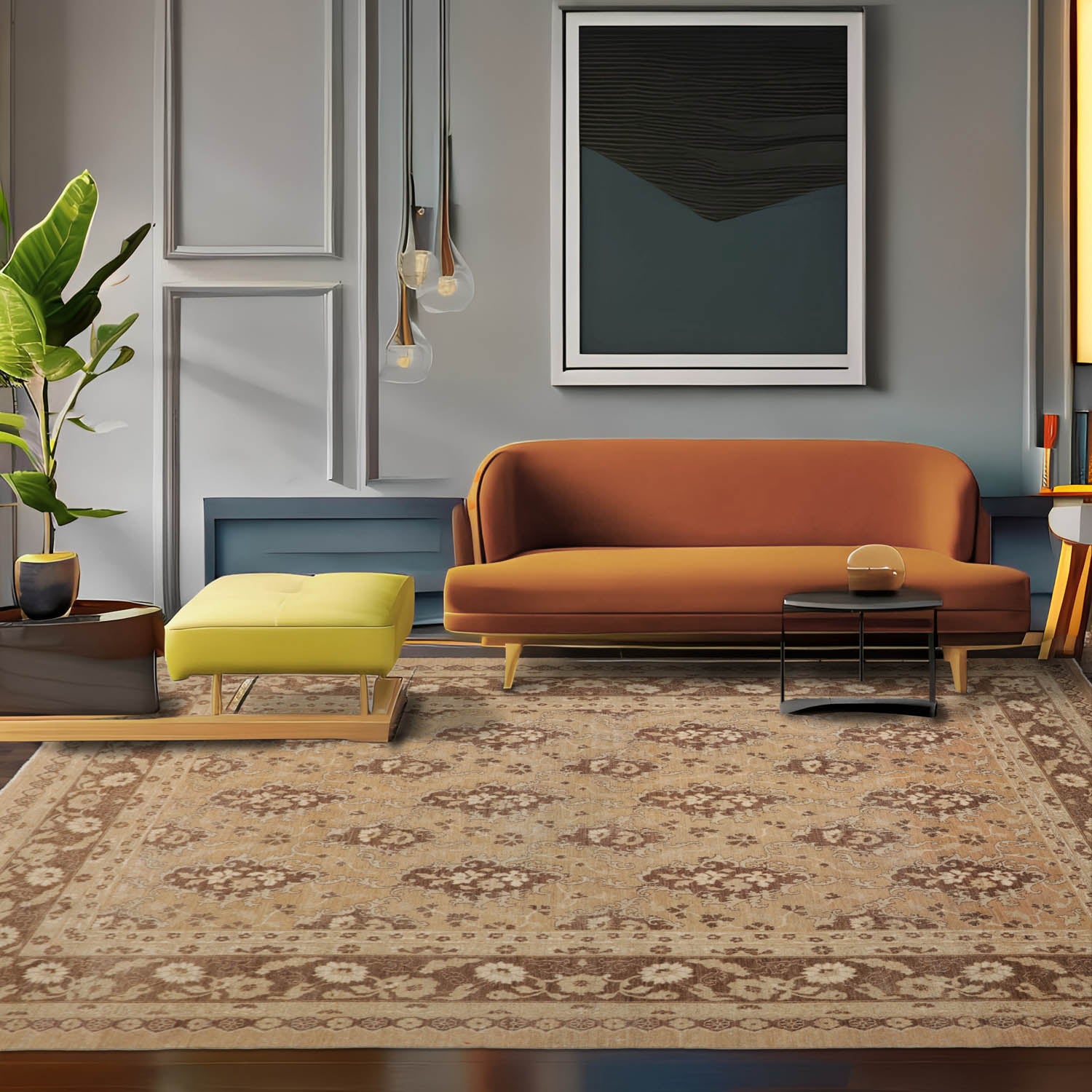 Story Behind the Art: Hand-knotted rugs are Pakistan's second-largest cottage and small industry that began as early as the 11th century under the Mughal rule. The craftsmen have the capacity to produce any type of rug using all the popular motifs of guls, medallions, paisleys (botehs), traceries, and geometric designs in various combinations. While the "stone washes" are used to fade and soften colors, the Peshawar style is characterized by a thinly sheered pile, large print designs, and most predominantly, their antique ivory and sometimes golden tones.