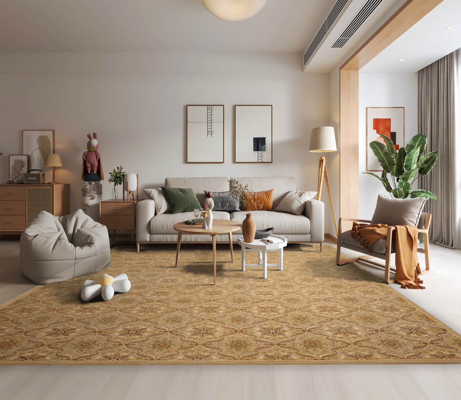 Story Behind the Art: Hand-knotted rugs are Pakistan's second-largest cottage and small industry that began as early as the 11th century under the Mughal rule. The craftsmen have the capacity to produce any type of rug using all the popular motifs of guls, medallions, paisleys (botehs), traceries, and geometric designs in various combinations. While the "stone washes" are used to fade and soften colors, the Peshawar style is characterized by a thinly sheered pile, large print designs, and most predominantly, their antique ivory and sometimes golden tones.