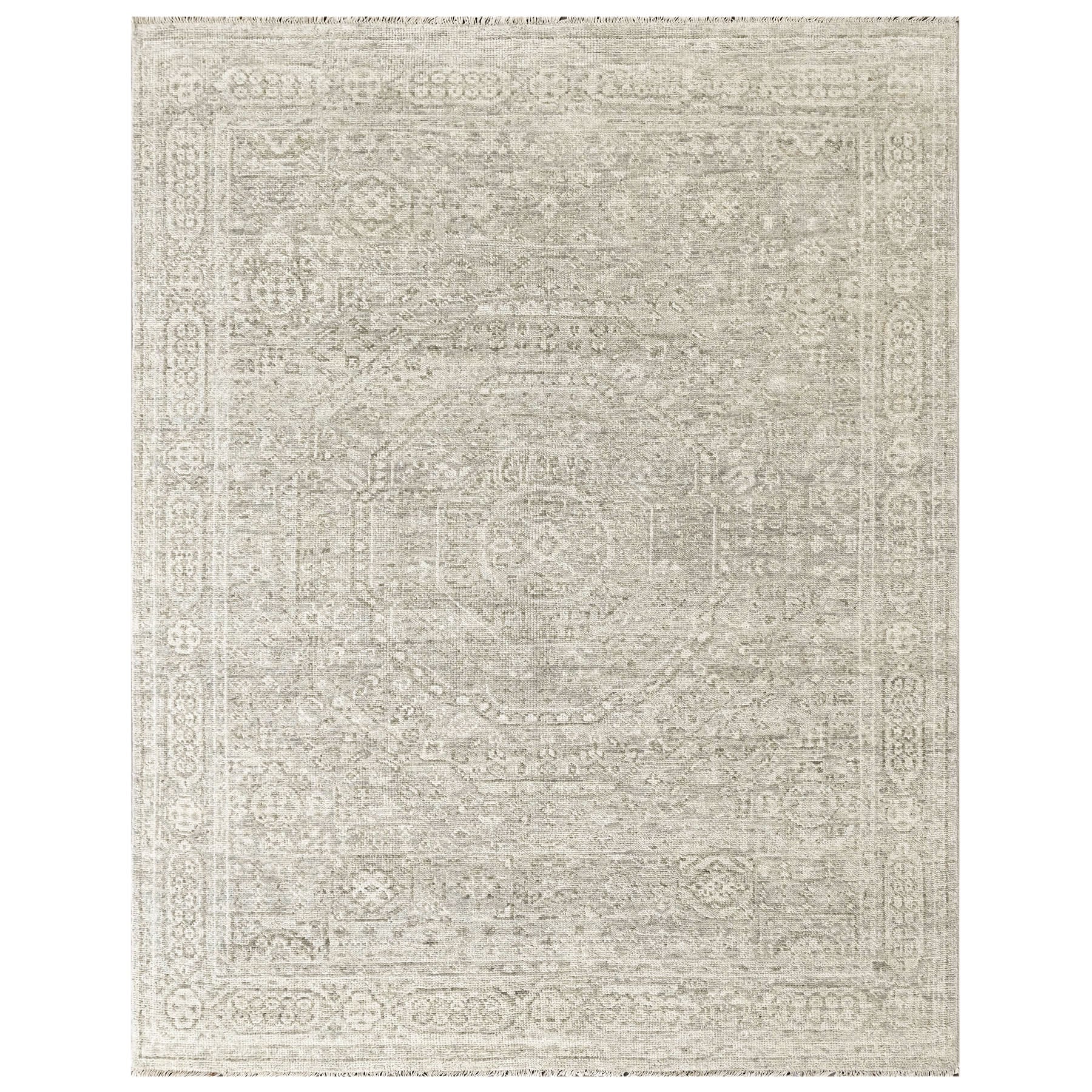 Anchored in classical Persian tradition and refined through a modern monochromatic approach, this 8x10 hand-knotted wool tone-on-tone gray rug features a medium pile on a durable cotton foundation, offering timeless sophistication and lasting quality. The design is structured around a traditional central medallion that subtly emerges from the field, surrounded by layered floral bands and intricate vinework inspired by historic Persian court rugs. Executed entirely in nuanced shades of gray, the pattern relies on texture, knot density, and tonal contrast rather than color to define its form, resulting in a sculptural, dimensional surface. Delicate rosettes, palmettes, and flowing arabesques are seamlessly integrated into the field, while faint geometric detailing reinforces the medallion’s outline. The border continues this restrained elegance with finely articulated floral bands rendered in harmonized gray tones. Refined and quietly expressive, this rug is especially suited for formal living rooms, bedrooms, or minimalist interiors where craftsmanship and subtle pattern are meant to elevate the space.
